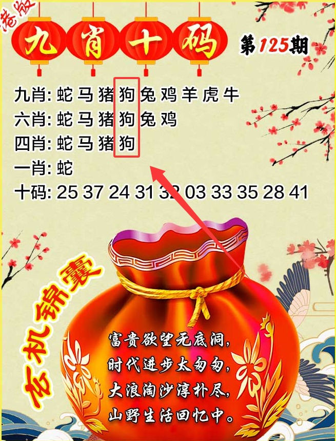 125期藏宝图:【正是陶钧海内年】 浅解:海内年,解家禽牛鸡猪狗马羊 综合解肖:牛鸡猪狗马羊 |